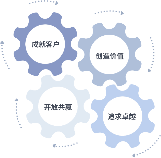 成就客户是一切决策的出发点,,创造价值是衡量所有工作的标准,,,追求卓越是我们做事做人的态度,,,,开放共赢是我们的格局也是最终的结果。。。。价值观的齿轮环环相扣,,,,推动着组织里的每个人不断向前。。。。