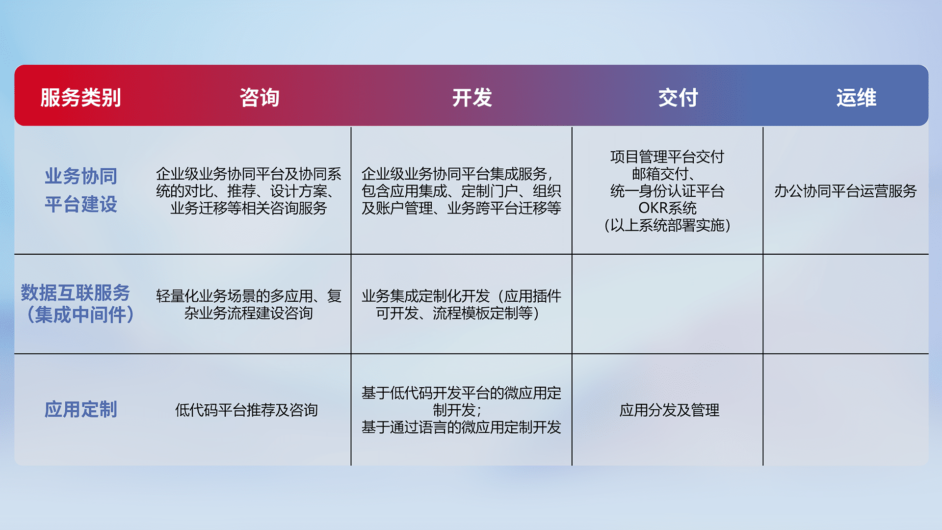 针对钉钉、、企微、、、IDaas等平台级产品提供产品的规划、、方案、、、、交付、、、、定制化开发等服务,,,,实现如统一协同办公、、、、智能客户服务、、、混合会议管理、、、、智能数据查询、、、、等业务场景,,实现数字化转型。。。